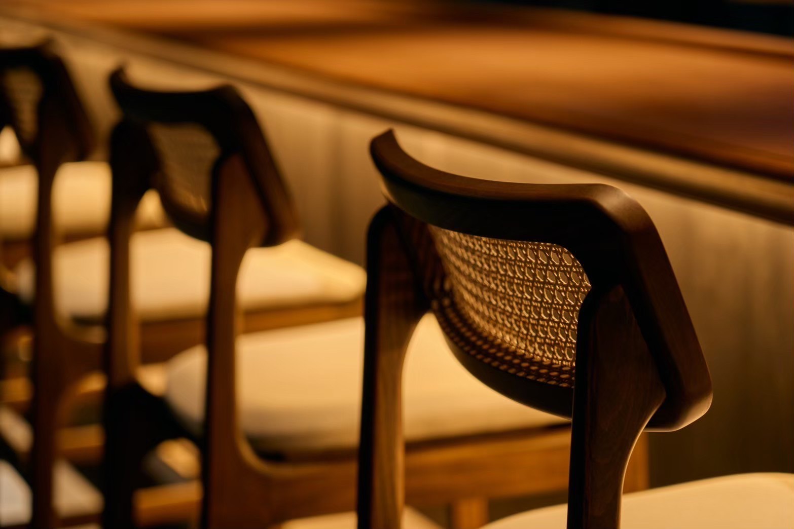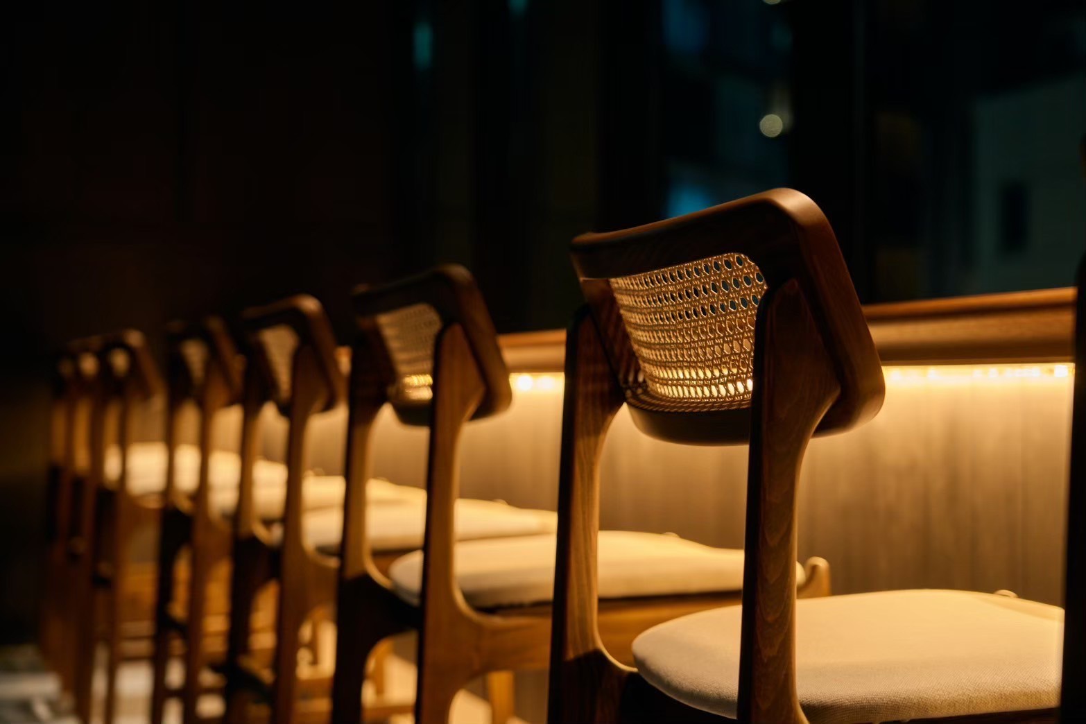 店内は間接照明と木の温もり、洗練された家具が調和し、心を静かに解きほぐす空間。