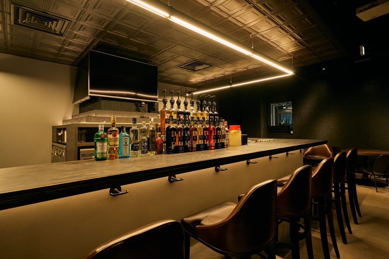 広々としたカウンターバーは、直線的なライティングと天井装飾でモダンな雰囲気を創出。