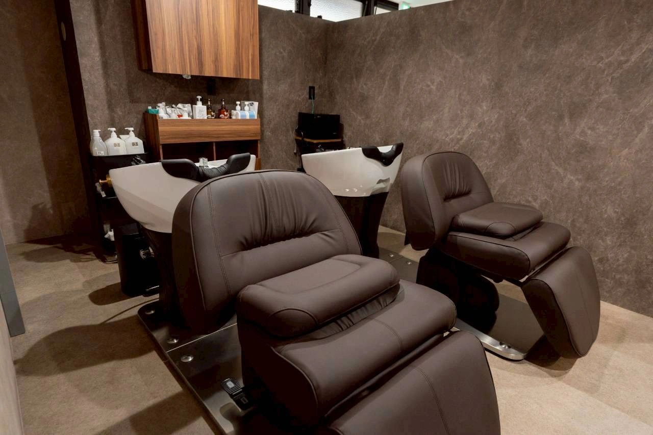 ・シャンプーブースは石目の壁×ダークボウルで引き締め、清潔感と機能性を両立。