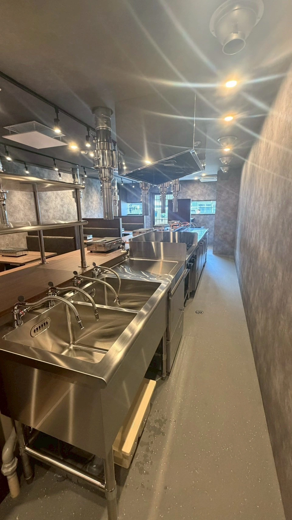 ・ダクトフードと厨房設備のステンレスが、清潔感と機能美を表現。