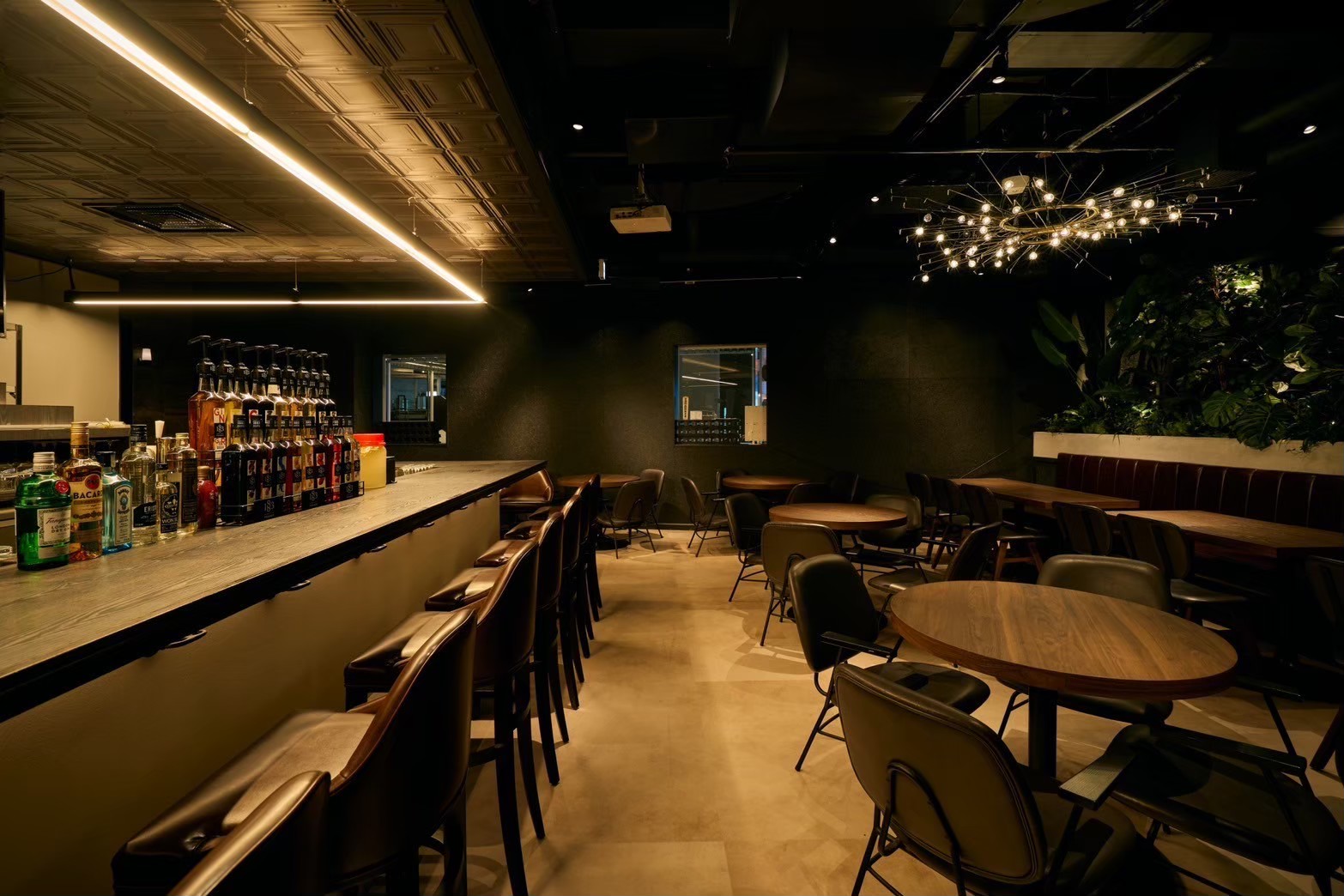 広々としたカウンターバーは、直線的なライティングと天井装飾でモダンな雰囲気を創出。