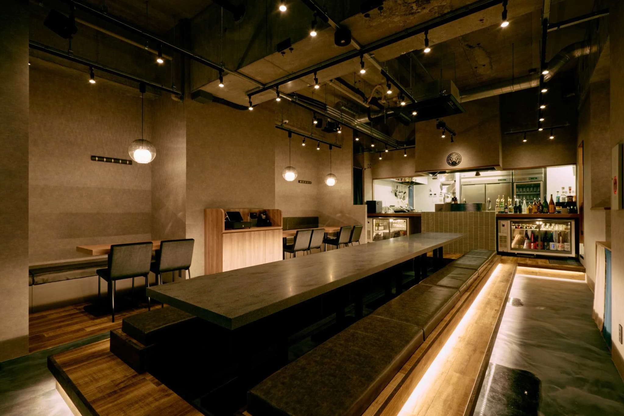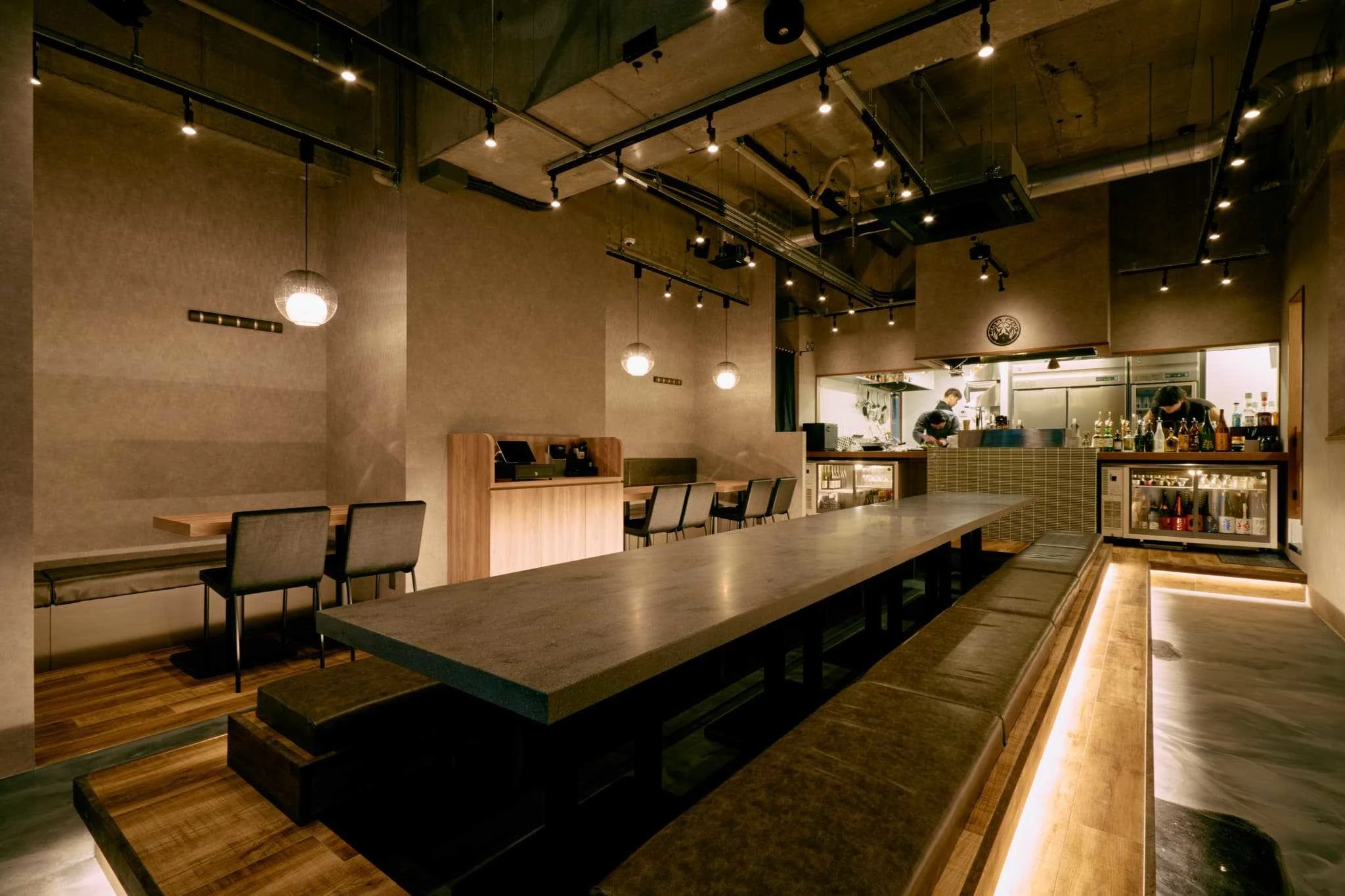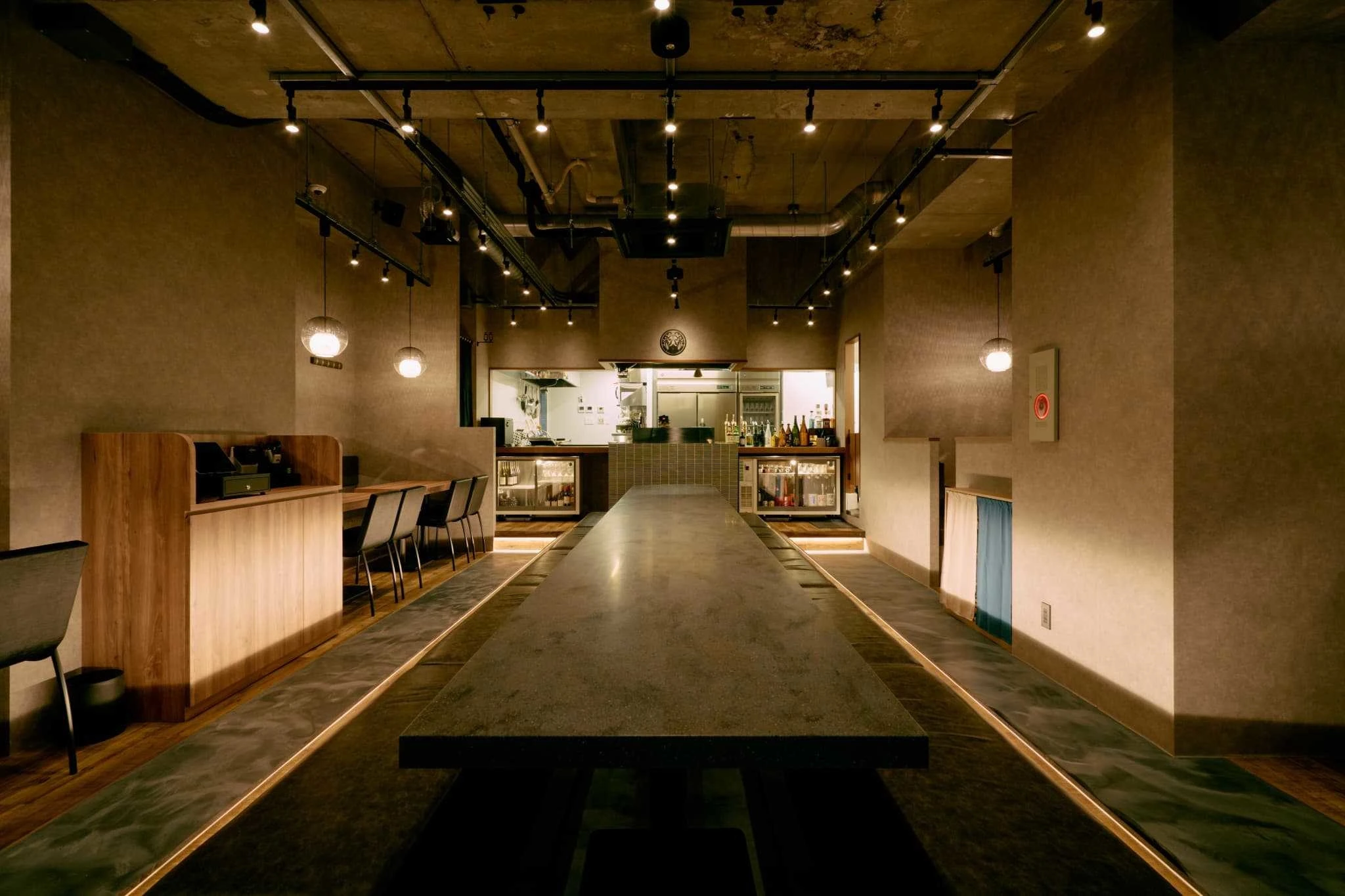 ・中央のロングテーブルが店内の軸となり、一体感とライブ感を演出。