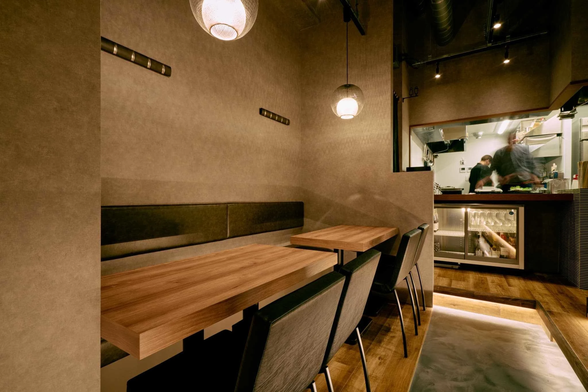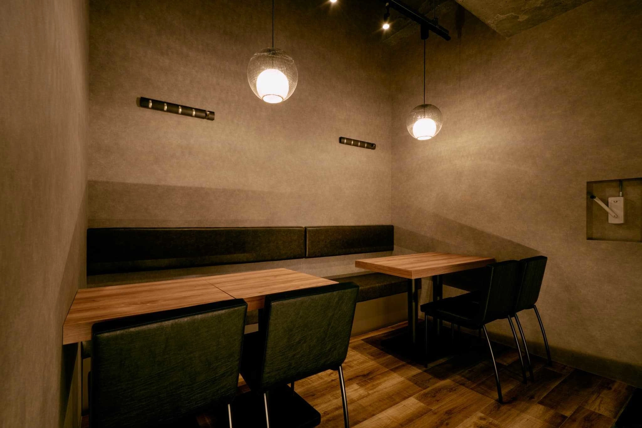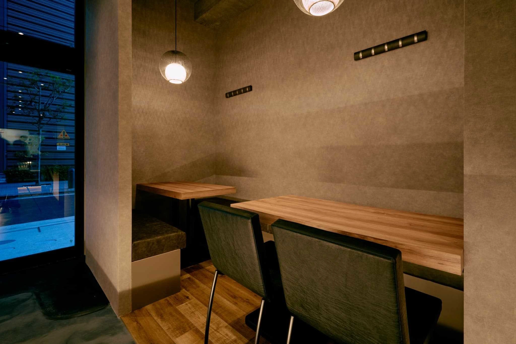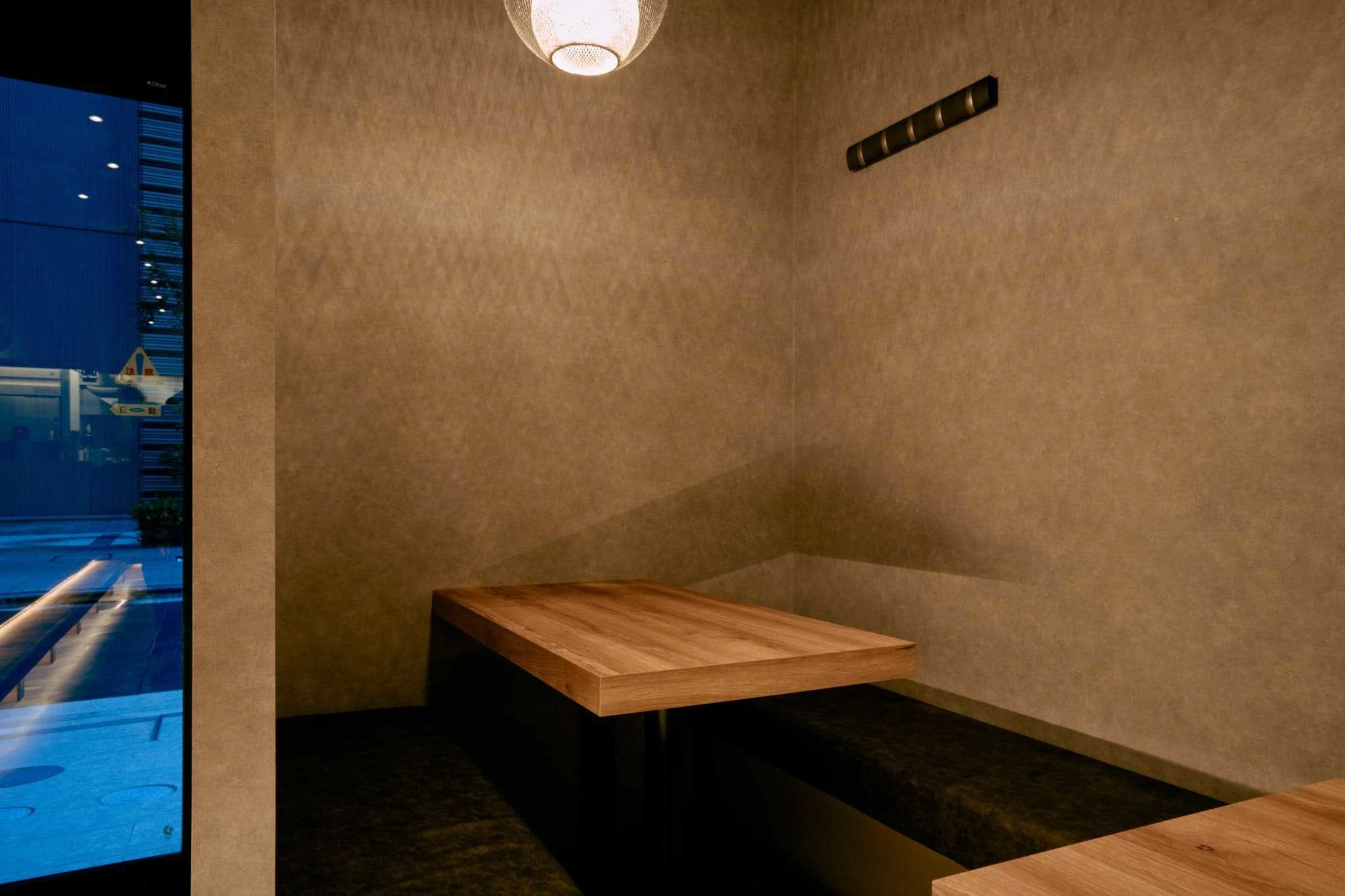 ・左官調の壁と、素材感にこだわった天板で、炭火料理に合う温度感のある空間に。